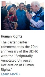 On December 10, 1948, the Universal Declaration of Human Rights (UDHR) was adopted by the UN General Assembly. To mark the 70th anniversary of this event, the Carter Center, founded by U.S. President Jimmy Carter, published a new compilation of Biblical texts that support the human rights proclaimed in the groundbreaking United Nations document. Sister Simone Campbell contributed, along with 14 other faith leaders, to the final document titled, “Scripturally Annotated Universal Declaration of Human Rights.”