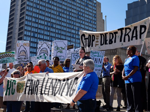 The rally participants came from all over Missouri, parts of Kansas, Nebraska, Iowa, Texas, Florida, and Pennsylvania. Kansas City was selected for the hearing because some of the most egregious abuses have occurred here. As anticipated, two large charter buses pulled up in front of the Music Hall to deliver over a hundred payday loan workers from surrounding areas. The employees of these storefront payday loans made the pleas to oppose the proposed regulations. During the four hours of hearings many of them stated how their services helped people in desperate situations. Activists and faith based speakers prefaced their comments with their name with “and I am not paid to be here.” One woman working at a payday loan office made an emotional plea not to enforce the proposed regulations since she needed her job; she just purchased a home and has two daughters to support. How perverse is this?