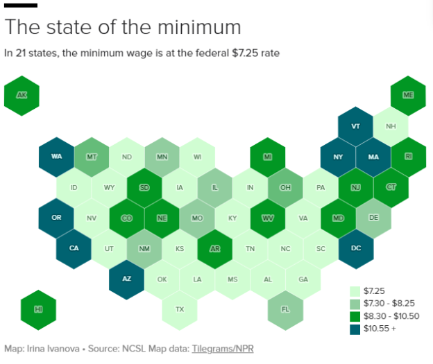 The concept of a minimum wage establishes a floor of compensation below which workers cannot hope to support themselves: our floor has been set at $7.25/hour since 2009. That federal minimum wage has not increased with inflation, either, so it loses value over time. Over those 10 years, it has become increasingly difficult for someone working a full-time minimum wage job to cover their basic needs. Earning the minimum wage does not ensure a livable income but having a fair minimum wage goes a long way towards helping low-income workers get by.