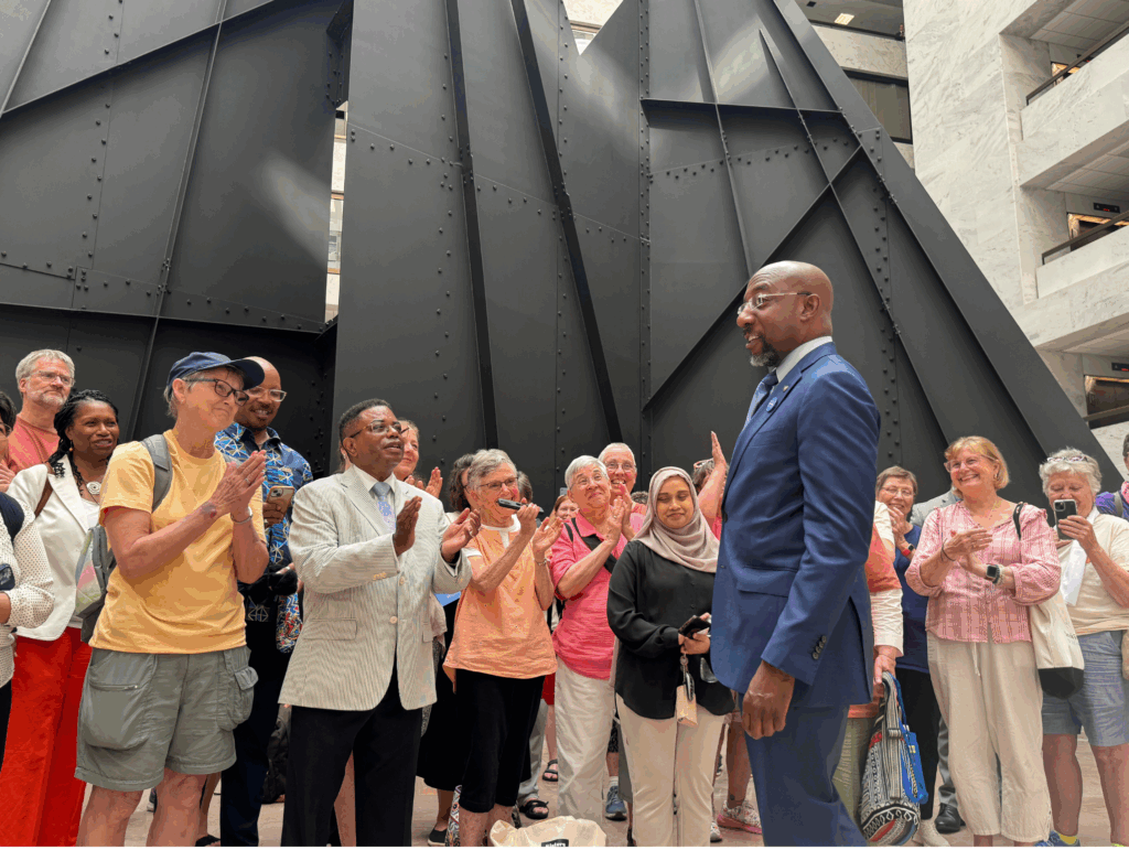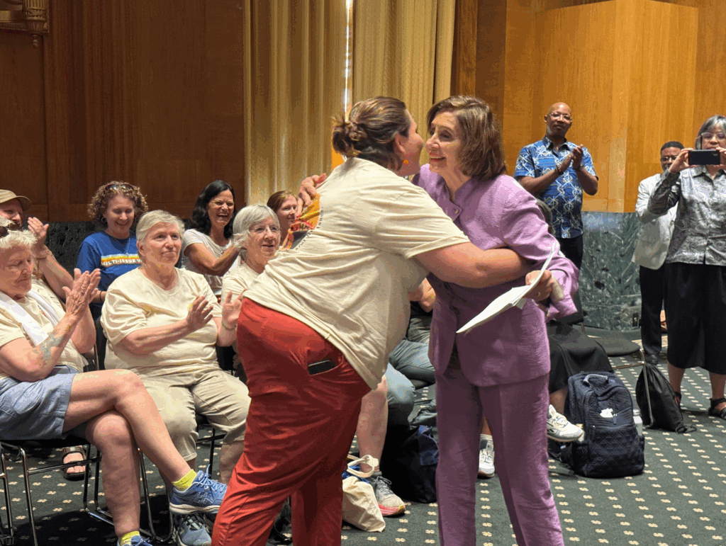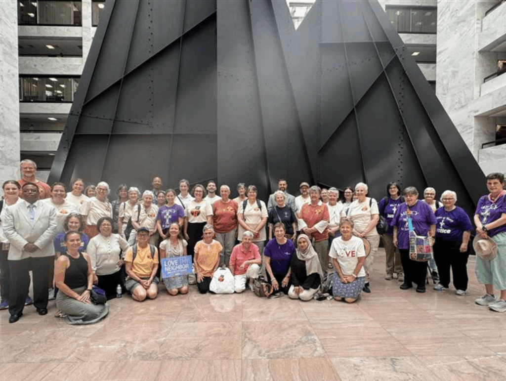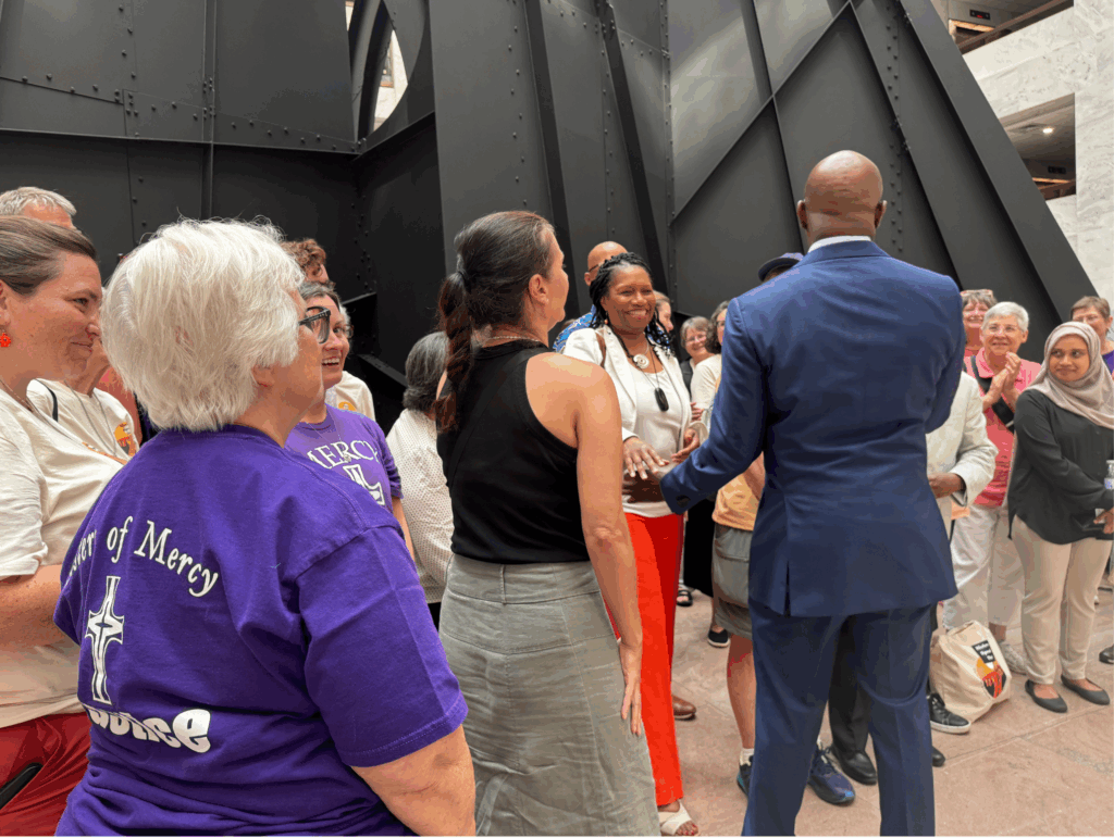 Through excessively high temperatures, spirits and hopes remained high through passionate Sister stories and reflections, soul-stirring spirituals, and powerful prayers (including a lovely rosary to end the gathering). The Sisters did not end the day on a grassy patch on the Hill. Dozens were accompanied by NETWORK staff for lobby visits to Senate offices. Their day ended with time spent with Speaker Emerita Nancy Pelosi (CA-11) and Senator Raphael Warnock (GA) for conversation and prayer.
