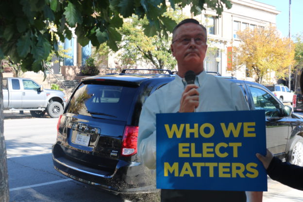 Sister Robbie Pentecost, an Oldenburg (IN) Franciscan Sister who ministers in Appalachia, greeted the crowd and told them we’re on the road working for tax justice for the common good. Then, Cedar Rapids resident, and former NETWORK executive director, Sister Kathy Thornton, RSM spoke. Sister Kathy is also a former Nun on the Bus. She emphasized the hardships and struggle of people in Iowa, particularly obtaining adequate mental health services, affordable healthcare and other vital services. Having requested an appointment for Nuns on the Bus (more than once) to meet with Rep. Blum or his staff without a response, she wondered aloud how he can represent Iowans without meeting or talking with them. How does he know of their struggles and concerns?