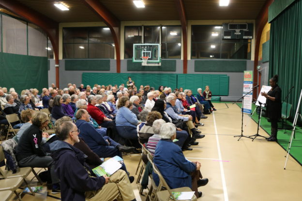 When we arrived to our Town Hall for Tax Justice in East Lansing, the gymnasium was full of very enthusiastic supporters of Nuns on the Bus. There were members of a number of congregations in the East Lansing area and a number of denominations. There were some who traveled from as far away as Kalamazoo, and others from near-by communities.