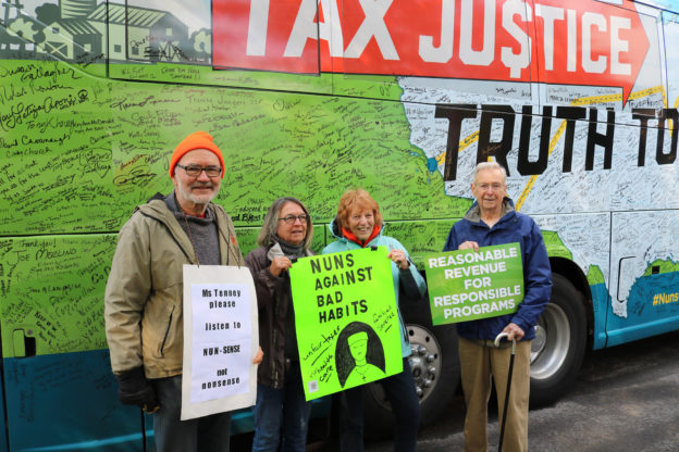 Otter sang a song which included the line- “better jobs, better health care and clean up for planet Earth.”  Sr. Simone ended the rally reminding the crowd of about 75 that we need tax justice to support 100% of the country and not the 1% and corporations. The Sisters then spread through the crowd to hand out pledge cards and Connection, the magazine of Network. With the signed pledge card, people came forward to sign the bus so they can go to Mar a Largo with the Nuns.
