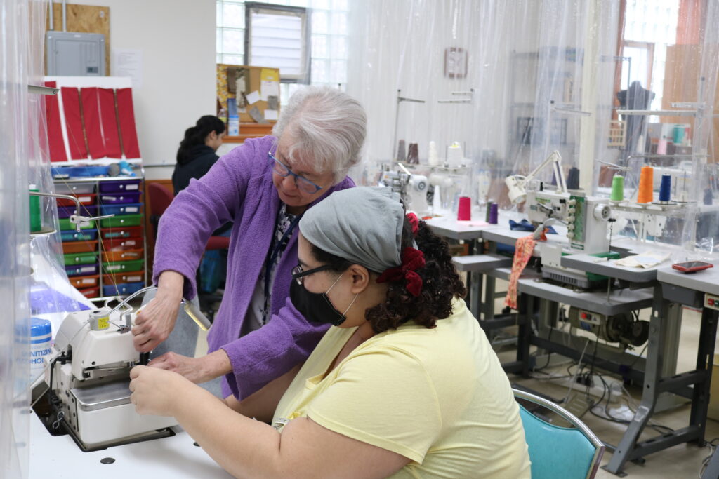 Founded by Sr. Mary Eileen Boyle, OSU in 1990, Esperanza Threads teaches low-income individuals how to sew industrially and works with local social service agencies and companies to place students in jobs. Many of the students at Esperanza Threads are former refugees who are looking for a job after having been resettled in Cleveland. For Eilis, this site visit was like coming full-circle. Prior to joining the staff at NETWORK, she ministered in refugee resettlement and sent many clients to Esperanza Threads for sewing and job skill training. Listening to the prophetic, community-building vision of Sr. Mary Eileen and Esperanza’s Executive Director Emily Tiell, reminded us about why we are Pope Francis voters who are committed to doing the work to build a multi-racial, inclusive democracy.