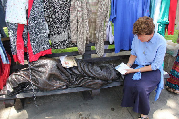 We emerged from the conversation to the space outside the cathedral for a short public program and were greeted by a diverse crowd and buzz of activity. When I spotted the t-shirt “The church has left the building,” I thought “How true about what’s happening here, about Nuns on the Bus”. We hadn’t yet seen the Homeless Jesus a short distance away.