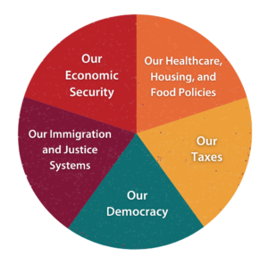 In a world of growing economic disparity and increasing individualism, we call for federal policies that dismantle systemic racism, eliminate the wealth and income gap, improve the wellbeing of our communities, and allow all people to thrive — especially those most often left out: women, people of color, people on the economic margins, and those at the intersections of these identities.