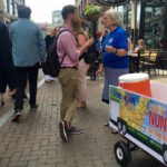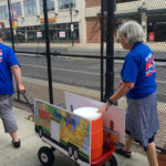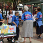 The Nuns on the Bus, wearing our own blue t-shirts, divided into two teams named “Holy Curiosity 1” and “Holy Curiosity 2” to spread across the downtown area. We were not selling anything or pushing a particular agenda or policy position. Rather, our mission was simply to offer free cups of lemonade to thirsty folks and engage RNC delegates and others in conversation. Each team pulled a red wagon, designed to look like our bus, which transported our jugs of lemonade.