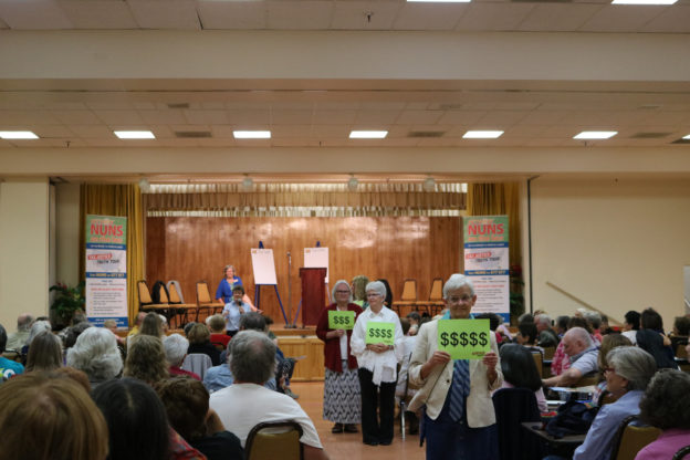 As we traveled more than 5,000 miles on the 2018 Nuns on the Bus trip, I was struck by the fact that at each of our 13 lobby visits (or attempted visits) constituents told us that their member of Congress would not meet with them. The most extreme was Representative Peter Roskam (IL-06) whose office was in a private airport building in West Chicago, Illinois. The building is secured by the Transportation Safety Administration (TSA) and no one could enter the building unless they had been screened by TSA. Additionally, groups could not hold rallies outside the building because it was a “safety issue.” So, this embattled Congressman was protected by TSA while his constituents and our bus had to hold our rally 2 blocks away from the office. I was stunned! This is not democracy!