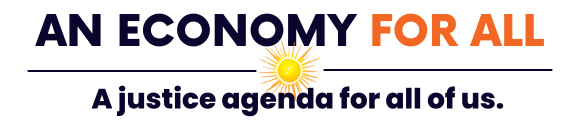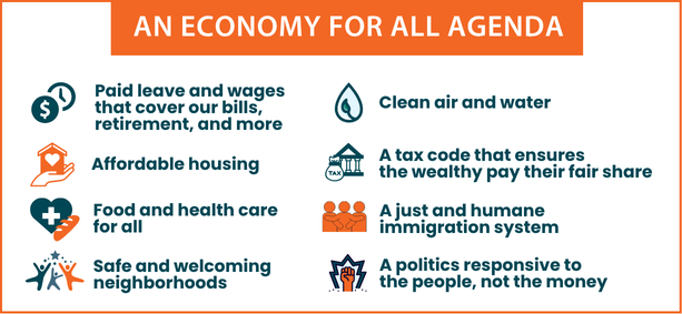 La agenda política de NETWORK Una economía para todos exige: empleos con permisos remunerados y salarios que cubran nuestras facturas, jubilación y más; vivienda, alimentos y atención médica asequibles; vecindarios seguros y acogedores; aire y agua limpios; un código tributario que garantice que los ricos paguen su parte justa; un sistema de inmigración justo y humano; y una política que responda a las personas, no al dinero.