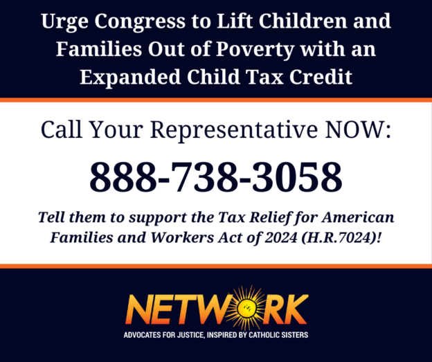 “Hello, my name is [YOUR NAME] from [YOUR TOWN]. I want to let [REPRESENTATIVE’s NAME] know that our country needs to reduce child poverty–which has doubled since 2022. That’s why I support the bipartisan-supported Tax Relief for American Families and Workers Act of 2024 (H.R.7024). As a NETWORK Lobby for Catholic Social Justice advocate, I believe it is immoral for children to go without meals, medical care, housing, and other vital needs. This CTC proposal will give lower-income parents the money they need to properly provide for their families.