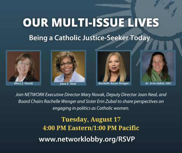 Join NETWORK Executive Director Mary Novak, Deputy Executive Director and Chief Equity Officer Joan Neal, and Board Chairs Rachelle Wenger and Sr. Erin Zubal, OSU as they share their perspectives on engaging in politics as Catholic women. Or watch on Facebook Live.