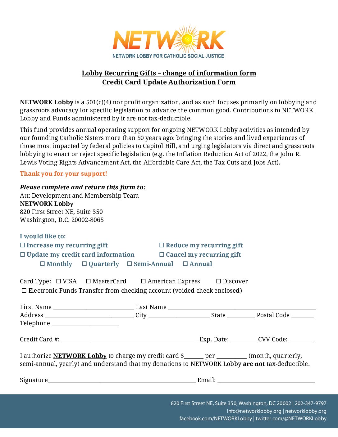 To make changes to your NETWORK Lobby recurring gift, please print this form. You can mail it to our office: